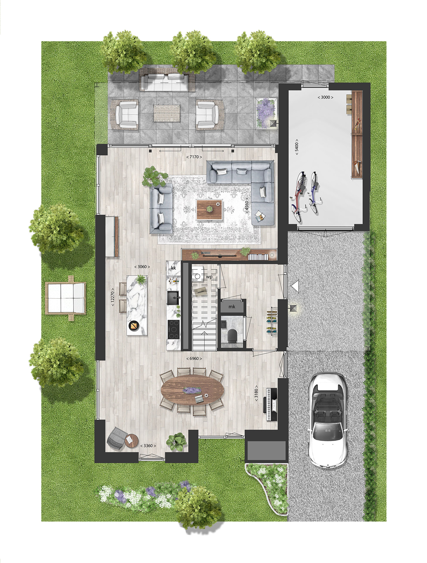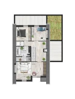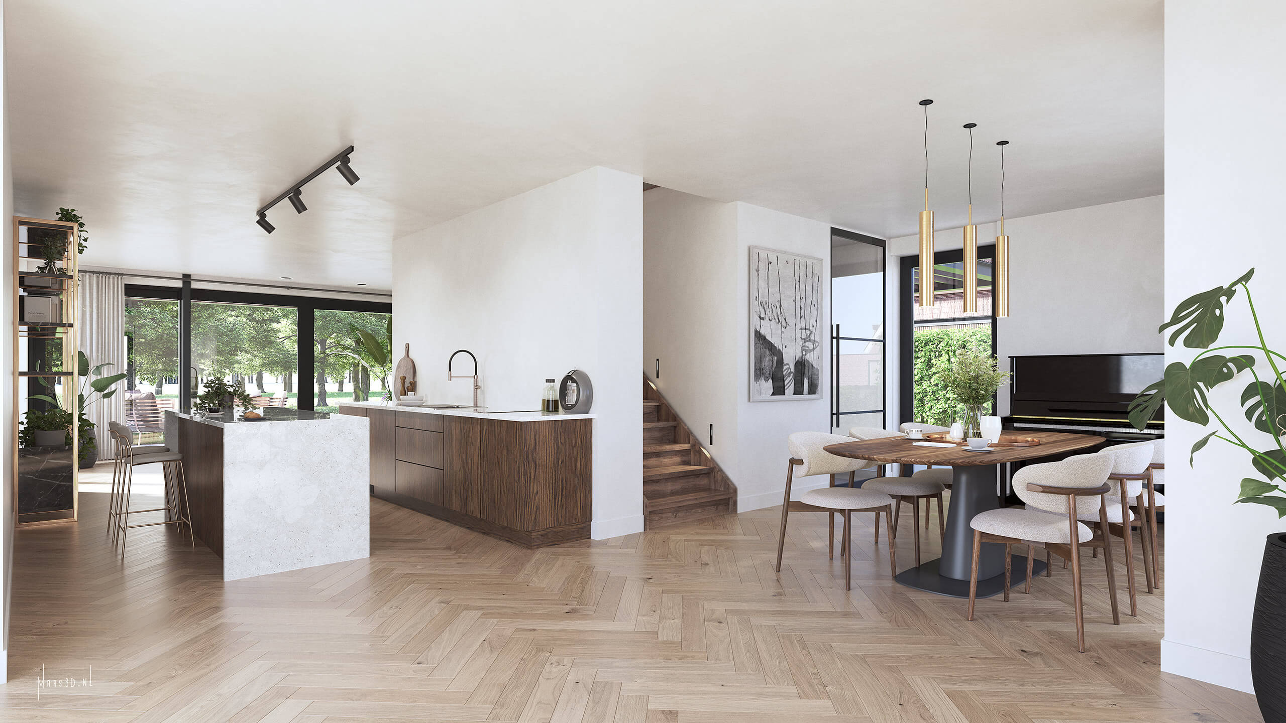 De woningen beschikken over een ruime eigen kavel met twee parkeerplaatsen op eigen terrein. Binnen bieden ze alles wat je mag verwachten van hedendaags, comfortabel wonen. De grote woonkamer loopt vloeiend over in een open keuken met zicht op de tuin. Verder vind je op de begane grond een ruime berging en een technische ruimte.