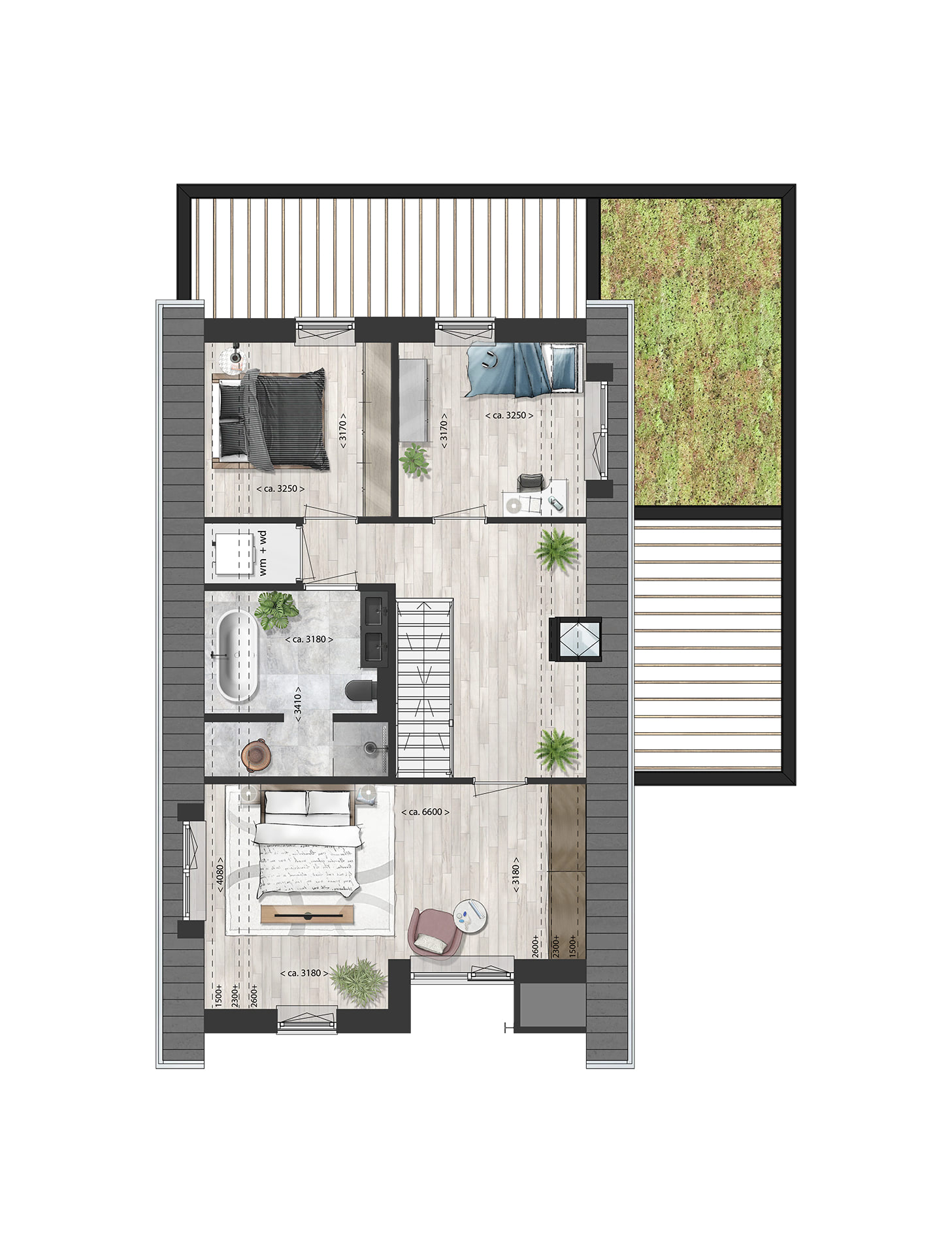 Op de eerste verdieping bevinden zich drie royale slaapkamers en een complete badkamer. De tweede verdieping is een volwaardige zolderverdieping met hoge kap, die nog vrij in te delen is – bijvoorbeeld als extra slaapkamer, werkkamer of hobbyruimte.