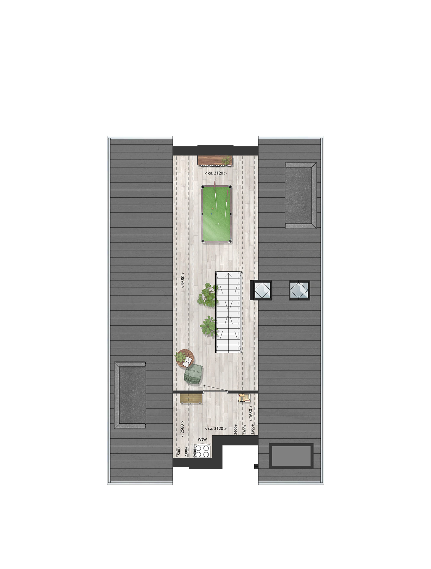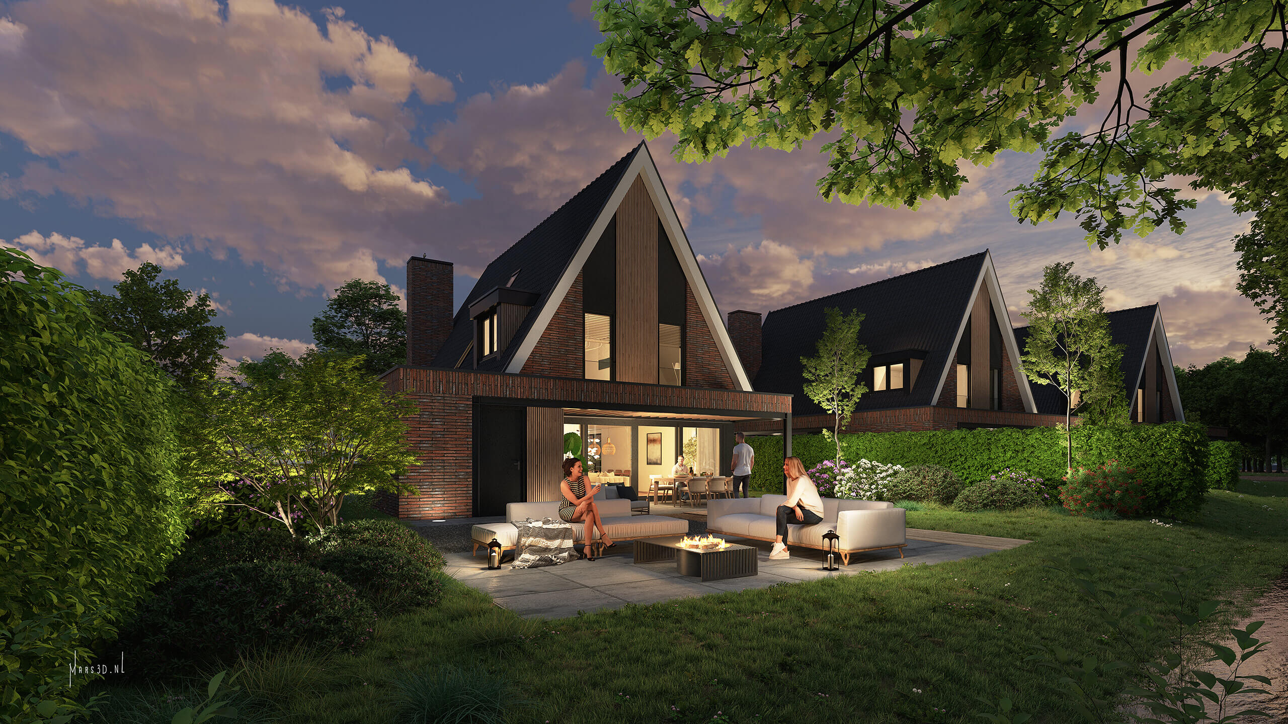 Aan de rand van het hof komen drie vrijstaande woningen, waarvan de architectuur naadloos aansluit op het industriële karakter van het plan: robuust met een warme, hoogwaardige uitstraling. De gevels worden opgetrokken uit roodbruin metselwerk, afgewerkt met moderne details, forse overstekken en horizontale belijning die het volume verfijnen.